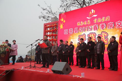 开幕式上,李荣健代表县委、县政府向本次盛会的顺利开幕表示热烈的祝贺,向参加开幕式的各位来宾、参展企业和广大父老乡亲表示诚挚的欢迎;旺苍县富渝房地产开发有限公司负责人代表参展企业进行表态发言。最后,杜非宣布2015年旺苍春季房交会正式开幕,并与参会领导共同触摸启动球启动房交会。