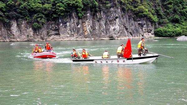 21日9时整,随着一声声急促的紧急集合哨的响起,武警旺苍县中队15名官兵和旺苍县共产党员防洪抢险突击队20名队员迅速集结在武警旺苍县中队操场,武警官兵和突击队员在中队指导员伏帅的带领下,乘坐大巴车随防汛指挥车、救护车迅速机动到高阳镇向阳村砂湾出险水域。副县长、县人民政府防汛抗旱指挥部指挥长沈友文立即下达了抗洪抢险指令,武警官兵和突击队员分别快速将冲锋舟和橡皮艇抬入河中,安装发动机,驾驶冲锋舟实施防汛应急救援科目的演练。演练模拟由于突发山洪导致河水猛涨,被困在河道中间孤岛上的2名垂钓者由于长时间淋雨惊吓而昏迷,参与救援的冲锋舟和橡皮艇采用避浪前行、迂回靠近等科学的施救方法,经十多分钟奋力营救,被困垂钓者被抬上冲锋舟驶回岸边。旺苍县人民医院救护人员早已在岸边准备好了担架,迅速将受伤垂钓者抬上救护车进行抢救,五分钟后获救垂钓者苏醒。