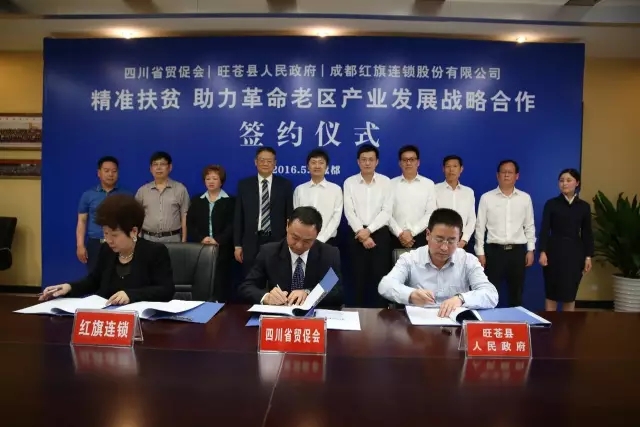 5月9日,省贸促会、旺苍县政府和成都红旗连锁股份有限公司三方签署了战略合作协议,三方将以“帮扶旺苍脱贫解困”为目标,搭建旺苍农特产品产销联合平台,带动贫困群众增收致富。省贸促会机关党委书记王志敏、机关巡视员苏红益,旺苍县委副书记、代县长余飞宇,红旗连锁党委书记、董事长、总经理曹世如,红旗连锁党委副书记、副董事长、董秘、常务副总经理曹曾俊等出席签约仪式。这是红旗连锁继与甘孜州丹巴县、江油市政府、阿坝州政府、巴中市政府等战略合作后的又一次成功签约,对促进更多企业参与到全省精准扶贫工作中将起到了很好的引领和示范作用。