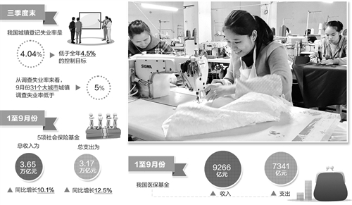 二是失业率。三季度末,我国城镇登记失业率是4.04%,低于全年4.5%的控制目标。从调查失业率来看,9月份31个大城市城镇调查失业率低于5%。