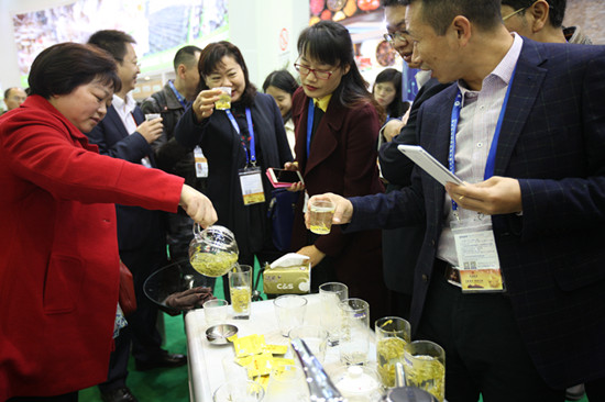 11月10日,第四届四川农业博览会(以下简称农博会)开馆。记者在农博会广元展馆特色产品展览展示现场,人流如潮,成都市民和省内外客商们追捧旺苍米仓山茶产品的热情不减往年。
