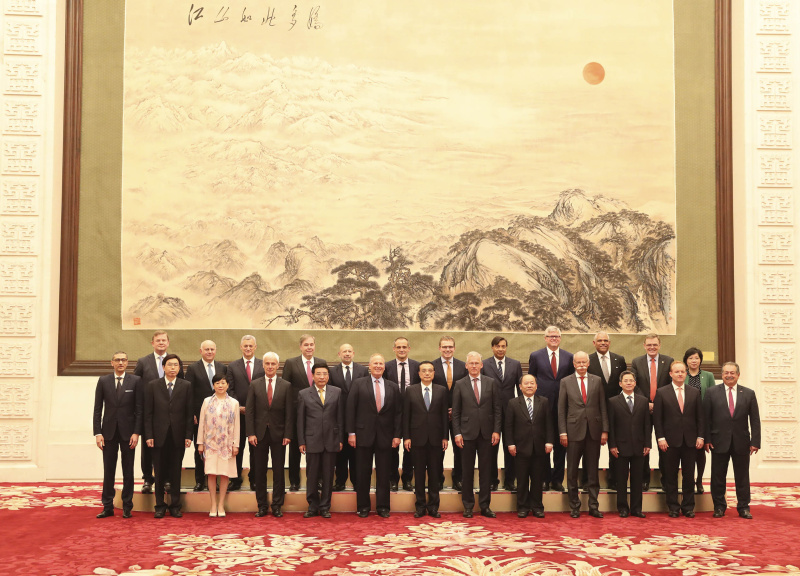 国务院总理李克强6月7日下午在人民大会堂会见来华出席“全球首席执行官委员会”第五届圆桌峰会的跨国企业负责人,并同他们座谈交流。