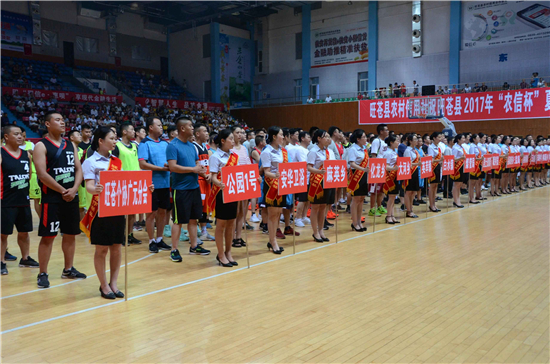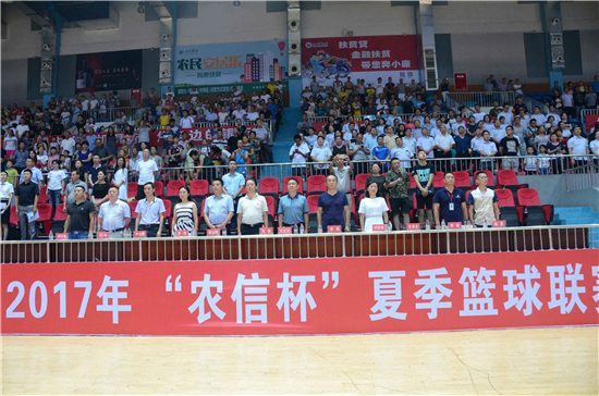 7月26日晚,我县2017年“农信杯”夏季篮球联赛在县文体中心拉开帷幕。县委常委、宣传部部长张健参加开幕式并宣布联赛开幕,县委常委、县委办主任杨光辉,县人大常委会副主任李剑,副县长李佳,县政协副主席何春晖参加开幕式。