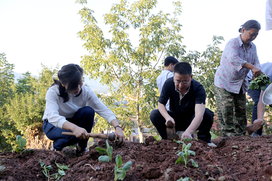 当天,余飞宇深入对口帮扶的贫困户许明金家开展“同吃同住同劳动”活动,在许明金家菜地里种上了一株株兰菜。