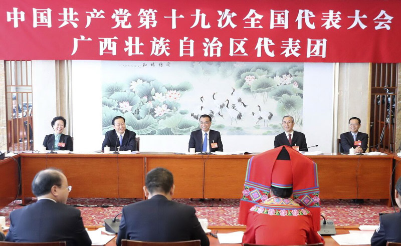 10月19日上午,李克强同志来到他所在的党的十九大广西壮族自治区代表团参加讨论。他说,习近平同志代表十八届中央委员会向大会所作的报告,回顾总结了过去5年党中央团结带领全党全国各族人民坚持和发展中国特色社会主义的辉煌成就和宝贵经验,对决胜全面建成小康社会、夺取新时代中国特色社会主义伟大胜利做了全面部署。报告凝聚全党智慧,反映时代要求和人民愿望,是指引全党全国各族人民把中国特色社会主义不断推向前进、迈向新时代的政治宣言和行动纲领。