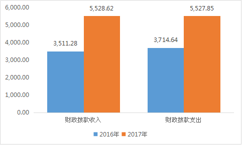 2017年度财政拨款收入总计5,528.62万元,与2016年收入相比,财政拨款收入增加2,017.34万元,增长57.45%。