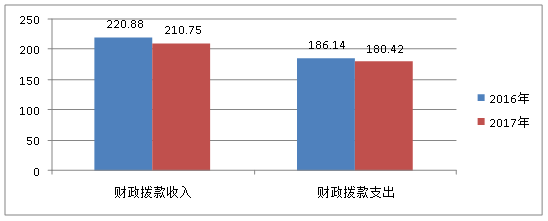 2017年度财政拨款收入总计210.75万元,支出总计180.42万元。与2016年财政拨款收入总计220.88万元、支出总计186.14万元相比,财政拨款收、支总计各减少10.13万元、5.72万元,下降4.59%、3.08%。