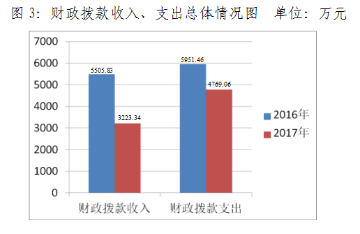 2017年度财政拨款收入总计3223.34万元。与2016年收入相比,财政拨款收入减少2282.49万元,下降41.46%。
