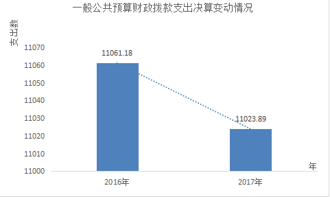 2017年度一般公共预算财政拨款支出11023.89万元,占本年支出合计的96%。与2016年相比,一般公共预算财政拨款减少37.29万元,下降0.3%。