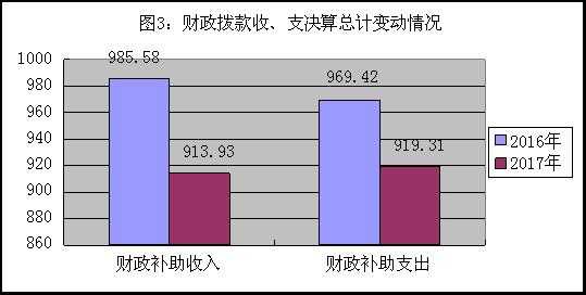 2017年度财政拨款收入913.93万元, 与2016年相比,财政拨款收入减少55.49万元,下降5.37%。2017年度财政拨款支出919.31万元,与2016年相比,财政拨款支出减少50.11万元,下降5.17%。