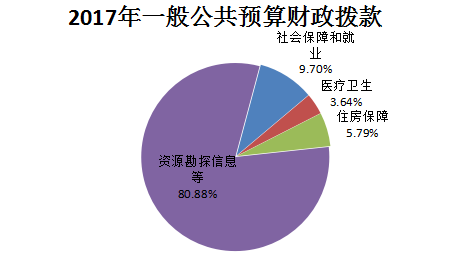 2017年一般公共预算财政拨款支出468.21元,主要用于以下方面:社会保障和就业支出45.41万元,占9.70%;医疗卫生支出17.02万元,占3.64%;住房保障支出27.10万元,占5.79%;资源勘探信息等支出378.68万元,占80.88%。