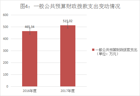 2017年度一般公共预算财政拨款支出515.02万元,占本年支出合计的97.79%。与2016年相比,一般公共预算财政拨款支出增加49.68万元,增长10.68%。