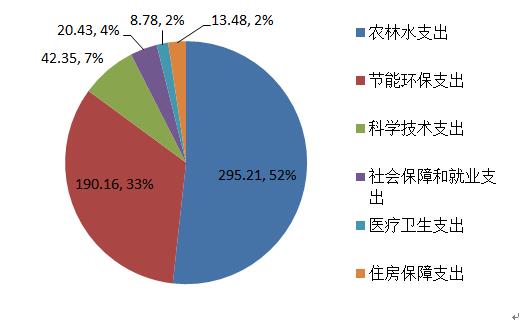 2017年一般公共预算财政拨款支出570.41万元,主要用于以下方面:农林水支出295.21万元,占51.75%;节能环保支出190.16万元,占33.42%;科学技术支出42.35万元,占7.42%;社会保障和就业支出20.43万元,占3.58%;医疗卫生支出8.78万元,占1.54%;住房保障支出13.48万元,占2.36%。
