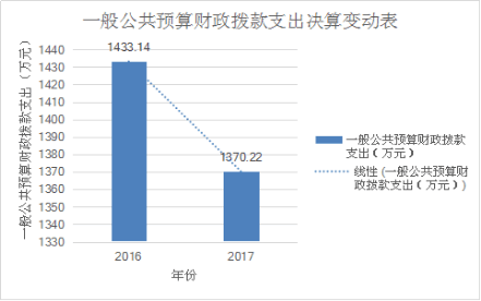2017年度一般公共预算财政拨款支出1370.22万元,占本年支出合计的100%。与2016年相比,一般公共预算财政拨款支出减少62.92万元,下降4%。