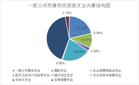 2017年一般公共预算财政拨款支出1370.22万元,主要用于以下方面:一般公共服务支出292.54万元,占21.35%;国防支出0.8万元,占0.06%;文化体育与传媒支出7.94万元,占0.58%;社会保障和就业支出142.09万元,占10.37%;医疗卫生与计划生育支出34.97万元,占2.56%;城乡社区支出280.64万元,占20.49%;农林水支出573.13万元,占41.83%;住房保障支出38.1万元,占2.78%。