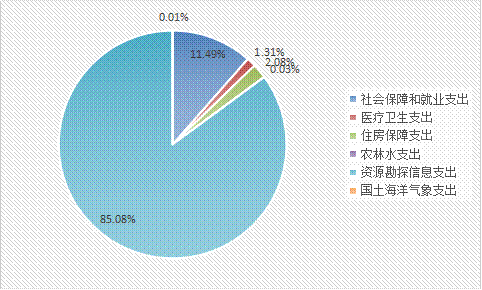 2017年一般公共预算财政拨款支出1283.80万元,主要用于以下方面:社会保障和就业支出147.56万元,占11.49%;医疗卫生支出16.88万元,占1.31%;住房保障支出26.67万元,占2.08%;农林水支出0.36万元,占0.03%,资源勘探信息支出1092.20万元,占85.08 %,国土海洋气象支出0.13万元,占0.01%。