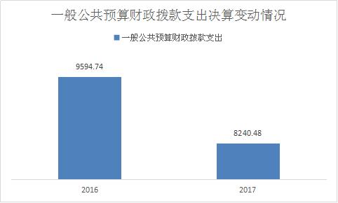2017年度一般公共预算财政拨款支出8240.48万元,占本年支出合计的77%。与2016年相比,一般公共预算财政拨款支出减少1354.26万元,下降14%。