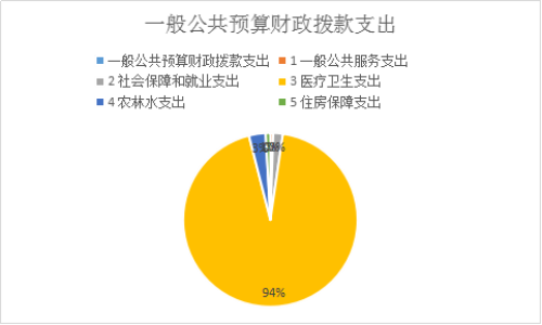 2017年一般公共预算财政拨款支出17349.98万元,主要用于以下方面:一般公共服务支出92.79万元,占0.5%;社会保障和就业支出305.28万元,占1.76%;医疗卫生支出16265.76万元,占93.75%;农林水支出534.33万元,占3.1%;住房保障支出151.83万元,占0.88%。