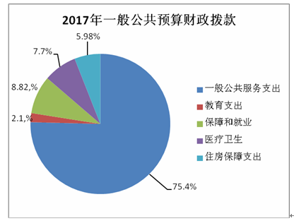 2017年一般公共预算财政拨款支出322.88万元,主要用于以下方面:一般公共服务支出243.36万元,占75.4%;教育支出6.93万元,占2.1%;社会保障和就业支出28.5万元,占8.82%;医疗卫生支出24.84万元,占7.70%;住房保障支出19.30万元,占5.98%。