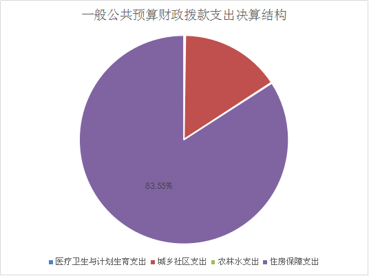 (二)一般公共预算财政拨款支出决算结构情况。2017年一般公共预算财政拨款支出6049.20万元,主要用于以下方面:一般公共服务支出2.5万元,占0.04%;社会保障和就业支出38.65万元,占0.64%;医疗卫生支出14.02万元,占0.23%;城乡社区支出933.89万元,占15.44%;农林水支出6.24万元,占0.10%;住房保障支出5053.92万元,占83.55%。