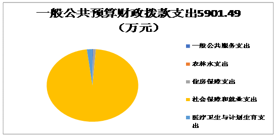 2017年一般公共预算财政拨款支出5901.49万元,主要用于以下方面:一般公共服务支出13.21万元,占0.22%;农林水支出0.36万元,占0.01%;社会保障和就业支出5714.25万元,占96.83%;医疗卫生与计划生育支出115.7万元,占1.96%;住房保障支出57.97万元,占0.98%。