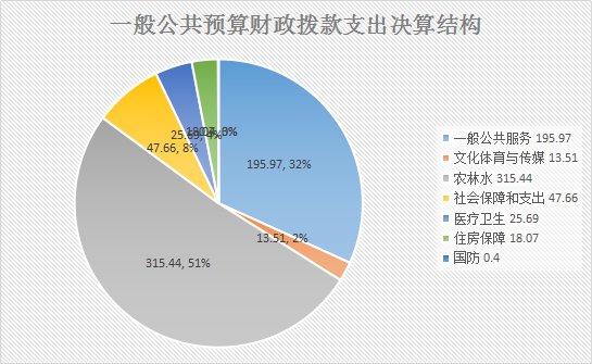 2017年一般公共预算财政拨款支出616.72万元,主要用于以下方面:一般公共服务支出195.97万元,占31.78%;文化体育与传媒支出13.51万元,占2.19%;农林水支出315.44万元,占51.15%;社会保障和就业支出47.66万元,占7.73%;医疗卫生支出25.69万元,占4.17%;住房保障支出18.07万元,占2.93%;国防支出0.4万元,占0.06%。
