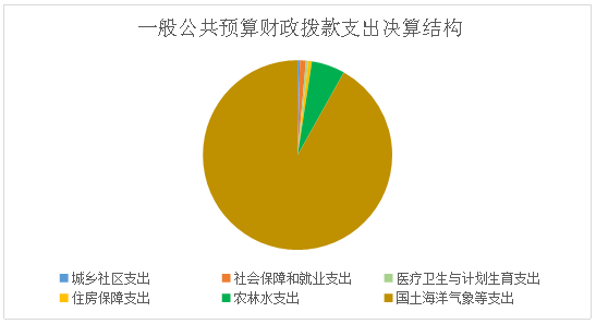 2017年一般公共预算财政拨款支出16168.03万元,主要用于以下方面:城乡社区支出65.06万元,占0.4%;社会保障和就业支出162.73万元,占1.01%;医疗卫生与计划生育支出66.57万元,占0.41%;住房保障支出99.60万元,占0.62%;农林水支出923万元,占5.71%;国土海洋气象等支出14851.07万元,占91.85%。
