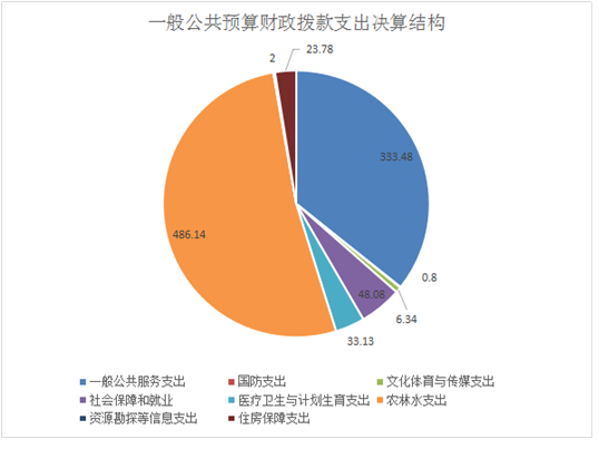 2017年一般公共预算财政拨款支出933.75万元,主要用于以下方面:一般公共服务支出333.48万元,占35.71%;国防支出0.8万元,占0.08%;文化体育与传媒支出6.34万元,占0.67%;社会保障和就业48.08万元,占5.14%;医疗卫生与计划生育支出33.13万元,占3.54%;农林水支出486.14万元,占52.06%;资源勘探等信息支出2万元,占0.21%;住房保障支出23.78万元,占2.54%。年末结转和结余54.51万元。支出决算总额较2016年增加67.58万元。