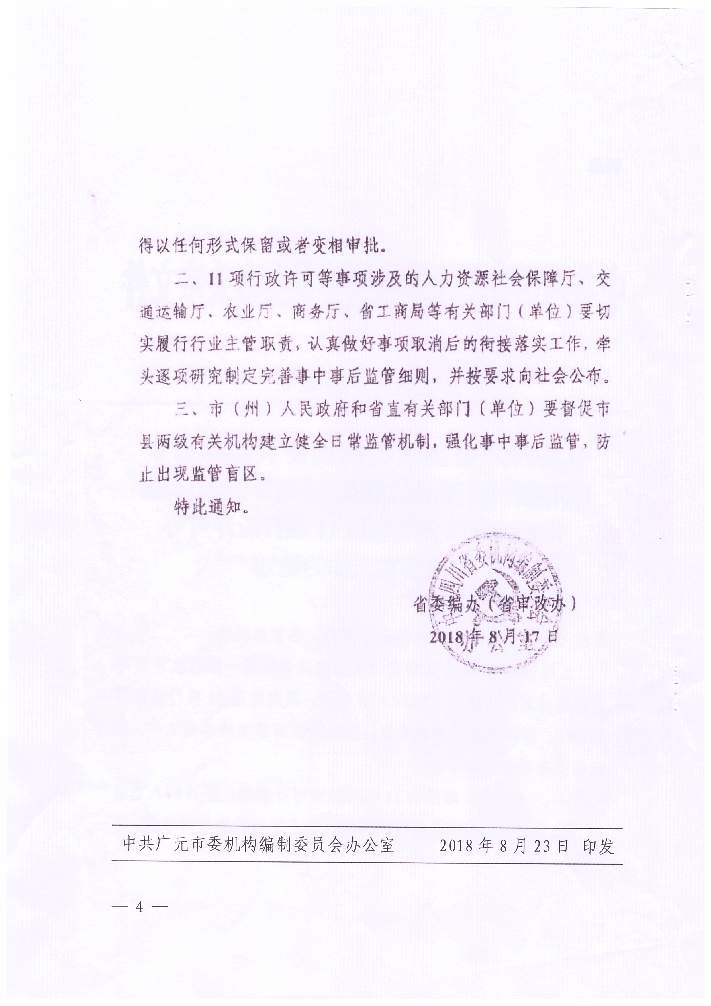 按照市委编办、市审改办通知要求,现将省委编办、省审改办《关于做好国务院取消11项行政许可等事项落实工作的通知》(川编办发〔2018〕62号)转发你们,并提出如下贯彻意见,请一并遵照执行。