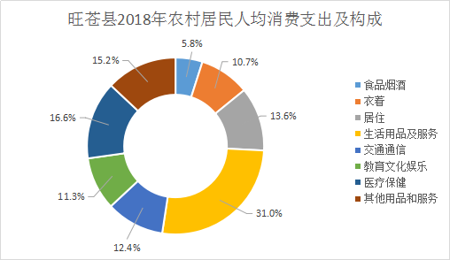 2018年,我县农村居民人均消费支出9966元,同比增长10.7%。其中,食品烟酒消费支出4206元,同比增长5.8%;衣着消费支出704元,同比增长10.7%;居住消费支出2220元,同比增长13.6%;生活用品及服务消费支出566元,同比增长31.0%;交通通信消费支出815元,同比增长12.4%;教育文化娱乐消费支出715元,同比增长11.3%;医疗保健消费支出547元,同比增长16.6%;其他用品及服务消费支出193元,同比增长15.2%。(县统计局  杨桂懿)