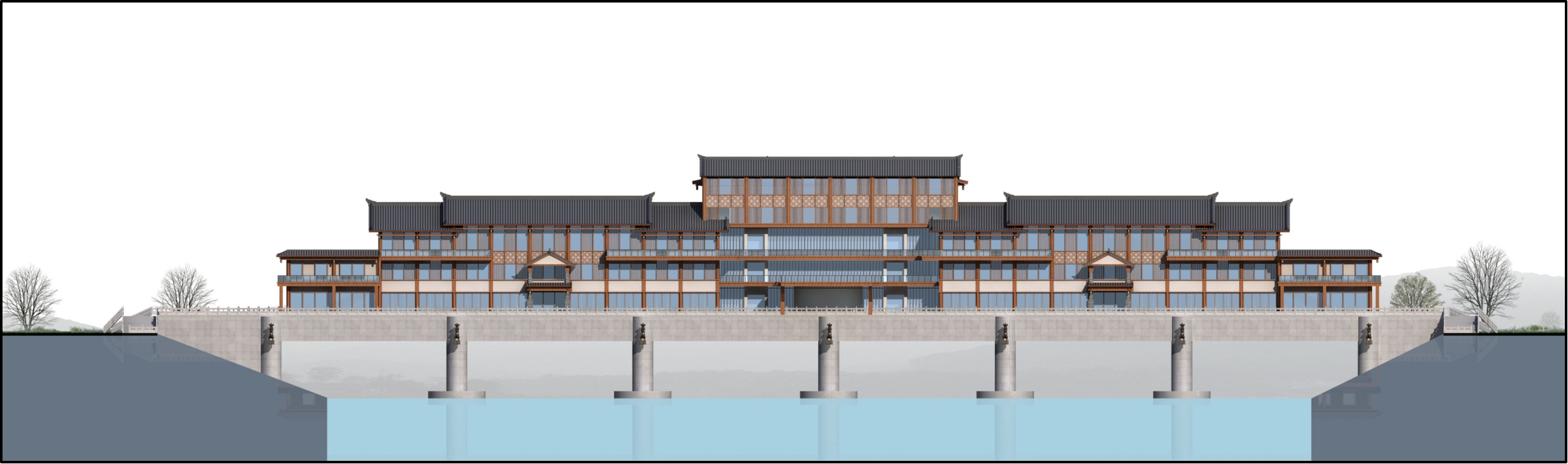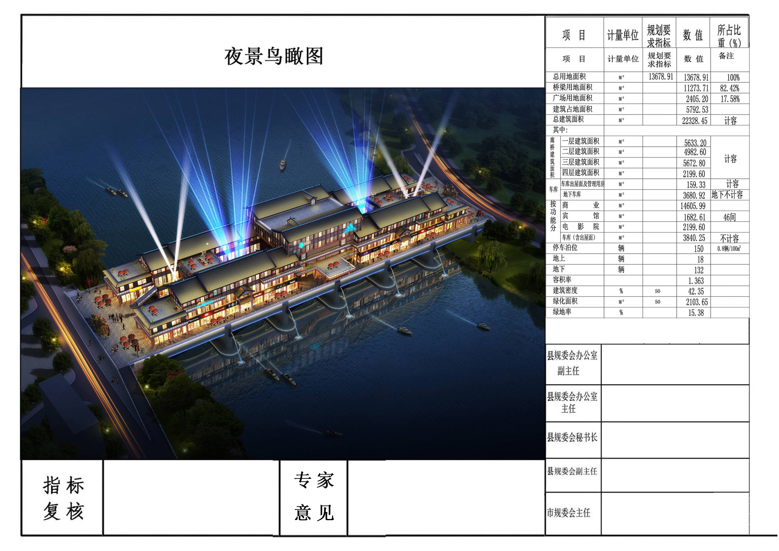 新桥桥梁一座,大桥总长187米,主跨共6跨,T梁长为30米,桥面总宽56米,洪水频率为100年一遇标准,结构安全等级为一级。经济技术指标为:总建筑面积22328.45平方米,其中商业建筑面积为14605.99平方米,宾馆建筑面积1682.61平方米,电影院2199.6平方米,车库出屋面及管理用房159.33平方米,地下车库建筑面积3680.92平方米(不计容)。容积率1.36,建筑密度42.35%,停车位150辆,绿地率15.38%,廊桥建筑层数2至4层。
