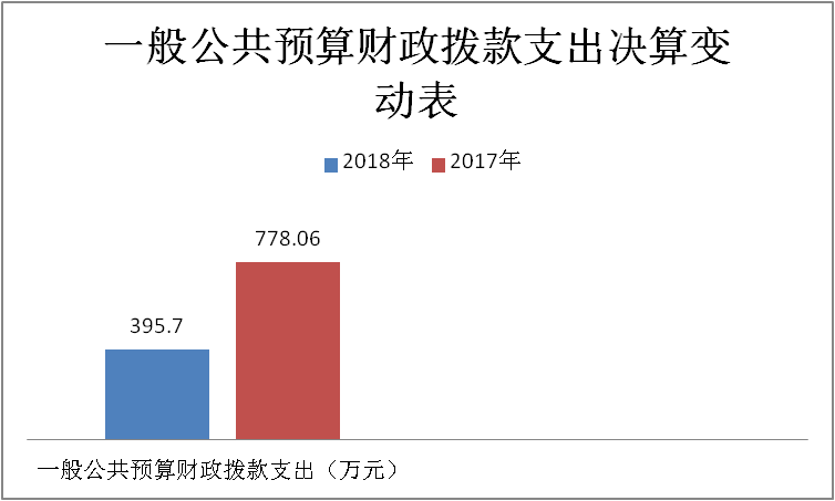 一般公共预算财政拨款支出决算总体情况: 2018年一般公共预算财政拨款支出395.7万元,占本年支出合计的99%。与2017年相比,一般公共预算财政拨款减少382.36万元,下降50%。主要变动原因是主要变动原因是2017年支出执行了上年度结转数559.76万元。 (图5:一般公共预算财政拨款支出决算变动情况)(柱状图)