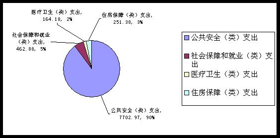 2018年一般公共预算财政拨款支出8581.41万元,主要用于以下方面:公共安全(类)支出7702.97万元,占89.76%;社会保障和就业(类)支出462.88万元,占5.39%;医疗卫生(类)支出164.18万元,占1.91%;住房保障(类)支出251.38万元,占2.94%。