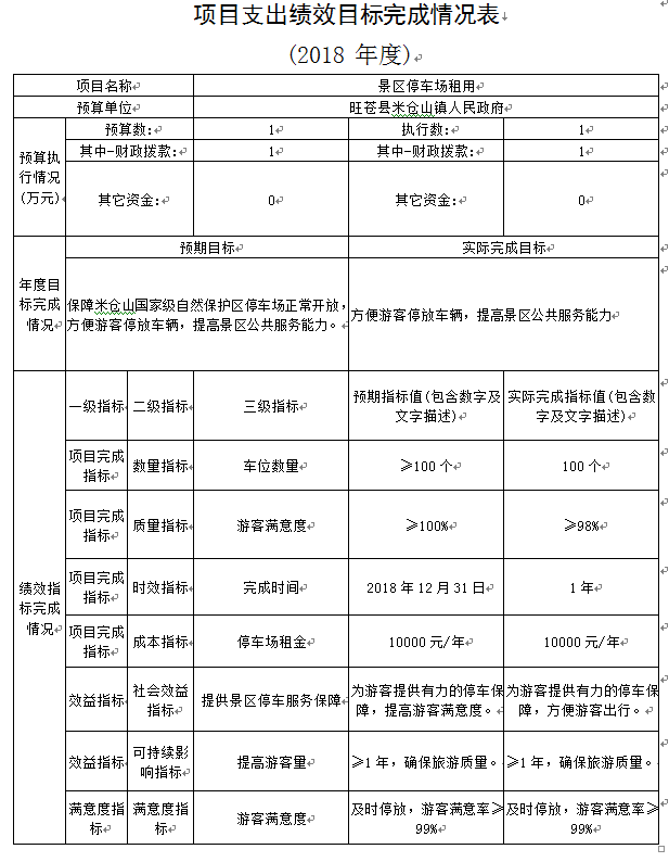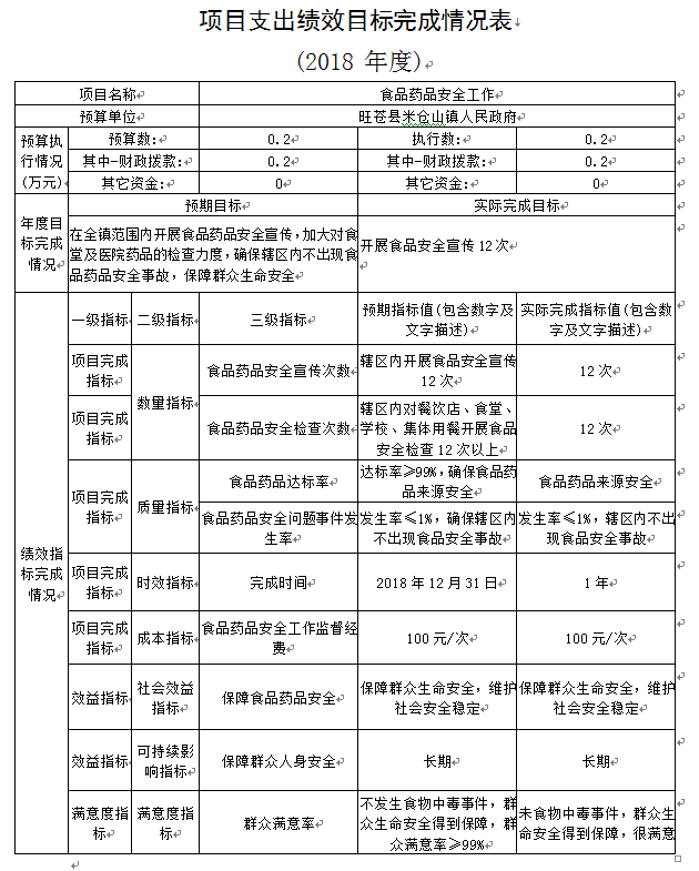 2018年我单位对预算8个项目开展了绩效评价申报,上报财政局并在镇政府公开,年末对8个项目开展检查,8个项目全部完成,且有6个项目全部完成支付;污水处理站运转支付7.31万元,剩下7.69万元县上财政吃紧未兑现支付;兵役征集0.4万元未支付。年终成立小组对污水处理站运转项目进行自评,得分96;整体完成情况良好。并对评分表进行公开,对检查出的问题及时进行整改。其余项目由项目负责人进行举一反三,并向镇政府报送自评报告。