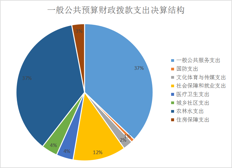 2018年一般公共预算财政拨款支出741.91万元,主要用于以下方面:一般公共服务(类)支出275.25万元,占37.1%;国防(类)支出0.4万元,占0.8%;文化体育与传媒(类)支出17.31万元,占2.3%;社会保障和就业(类)支出93.01万元,占12.5%;医疗卫生支出32.07万元,占4%;城乡社区支出28万元,占3.8%;农林水支出270.43万元,占36.5%;住房保障支出25.44万元,占3%;