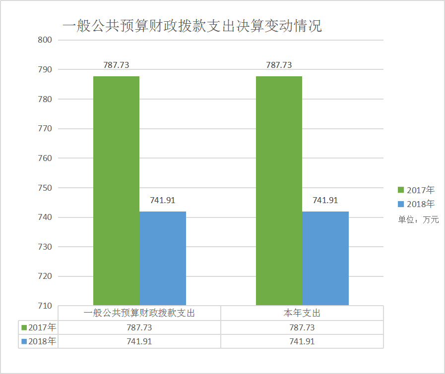 2018年一般公共预算财政拨款支出741.91万元,占本年支出合计的100%。与2017年相比,一般公共预算财政拨款减少45.82万元,下降5.82%。主要变动原因是本年度部分未列支。(图5:一般公共预算财政拨款支出决算变动情况)