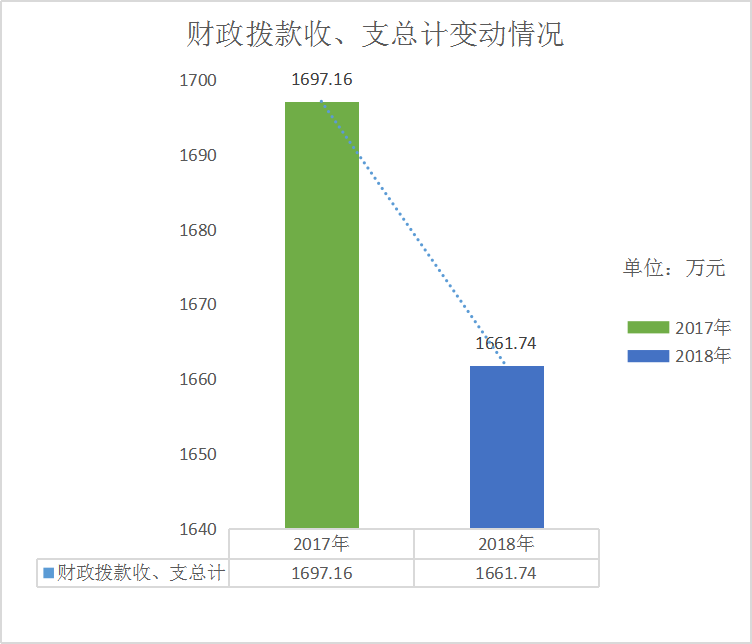 2018年度收、支总计1661.74万元。与2017年相比,收、支总计各减少35.42万元,下降2.1%。主要变动原因是为本年部分未列支。(图1:收、支决算总计变动情况图)