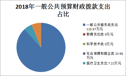 2018年一般公共预算财政拨款支出145.36万元,主要用于以下方面:一般公共服务(类)支出115.97万元,占79.78%;教育支出(类)0万元,占0%;科学技术(类)支出0万元,占0%;社会保障和就业(类)支出13.96万元,占9.6%;医疗卫生支出7.22万元,占5%;住房保障支出8.24万元,占5.62%。