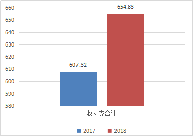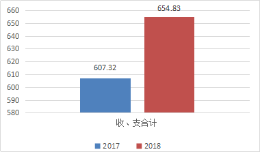 2018年度收、支总计654.83万元。与2017年相比,收、支总计各增加47.51万元,增长7.82%。主要变动原因是脱贫攻坚工作经费增加、人员工业务经费增加。