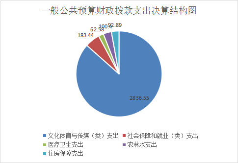 2018年一般公共预算财政拨款支出3,275.86万元,主要用于以下方面:文化体育与传媒(类)支出2,836.55万元占86.6%;社会保障和就业(类)支出183.44万元,占5.6%;医疗卫生支出62.58万元,占1.9%;农林水支出100.40万元,占3%;住房保障支出92.89万元,占2.9%。