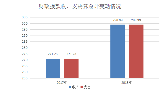 2018年度收、支出总计298.99万元,与2017年相比,收、支总计271.23万元增加27.76万元增加9.28%。主要变动原因是增加政策性调资、项目资金增加(图1:收、支决算总计变动情况图)(柱状图)