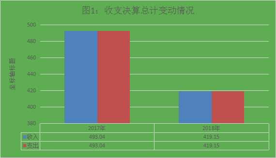 2018年度收、支出总计419.15万元。与2017年相比,收、支总计493.04万元减少73.89万元,下降14.99%。主要变动原因是在职人员退休减少,项目减少。