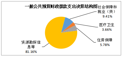 2018年一般公共预算财政拨款支出488.02万元,主要用于以下方面:社会保障和就业(类)支出45.91万元,占9.41%;医疗卫生支出17.86万元,占3.66%;住房保障支出28.19万元,占5.78%,资源勘探信息等支出396.06万元,占81.16%。