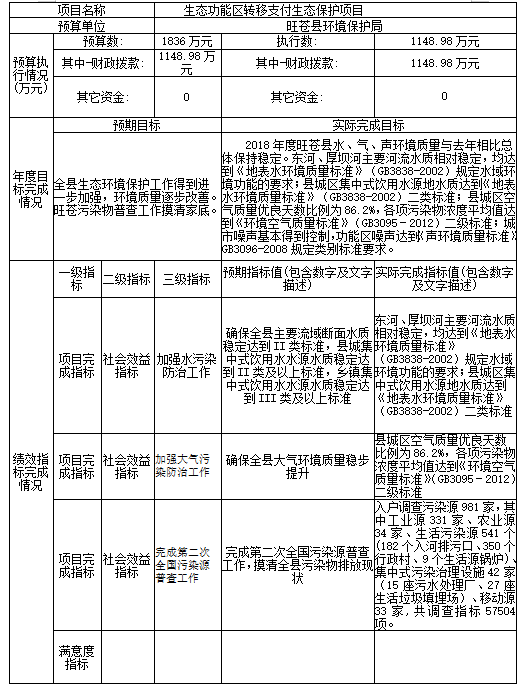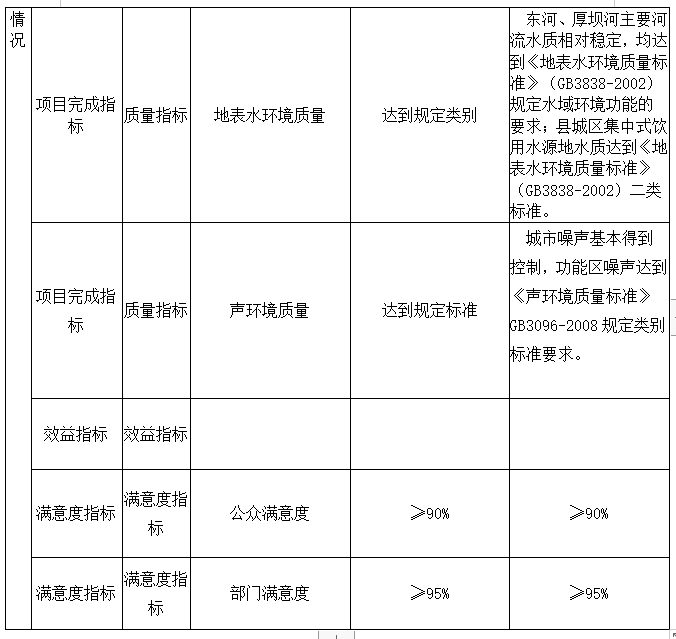 2018年,四川省生态环境保护大会明确提出要坚决打赢打好蓝天保卫战、碧水保卫战、黑臭水体治理攻坚战、长江保护修复攻坚战、饮用水水源地问题整治攻坚战、环保基础设施建设攻坚战、农业农村污染治理攻坚战、“散乱污”企业整治攻坚战“八大战役”。实施此项目有利于加快补齐生态环境短板,持续改善我县生态环境质量。该项目绩效目标设置明确且合理。