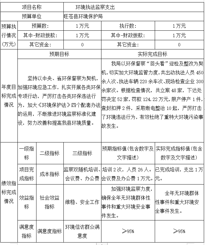 环境执法监察项目年初预算申报该项目1万元,2018年2月22日旺苍县财政局下达《关于批复2018年度部门预算的通知》(旺财预〔2018〕4号),符合资金管理办法等相关规定。项目申报内容与具体实施内容相符、申报目标合理可行。