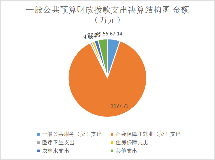 2018年一般公共预算财政拨款支出1165.07万元,主要用于以下方面:一般公共服务(类)支出67.14万元,占5.76%;社会保障和就业(类)支出1127.72万元,占96.79%;医疗卫生支出9.48万元,占0.8%;住房保障支出13.58万元,占1.16%;农林水支出20.36,占1.74%;其他支出49.56万元,占4.25%。