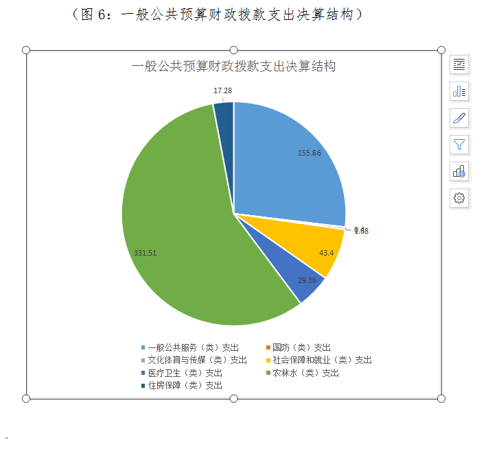 2018年一般公共预算财政拨款支出579.51,主要用于以下方面:一般公共服务(类)支出155.86万元,占27%;国防(类)支出0.4万元,占0.1%;文化体育与传媒(类)支出1.68万元,占0.3%;社会保障和就业(类)支出43.4万元,占7.5%;医疗卫生(类)支出29.36万元,占5.1%;农林水(类)支出331.51万元,占57%;住房保障(类)支出17.28万元,占3%。