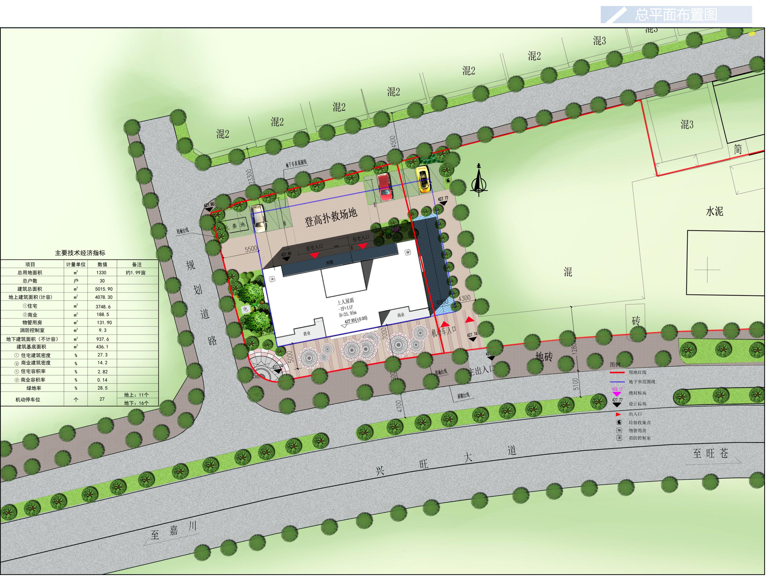 拟建方案经济技术指标为:总建筑面积5015.9平方米,其中地上建筑面积4078.3平方米(住宅面积3748.6平方米,商业面积188.5平方米,物管用房面积131.9平方米,消防控制室9.3平方米),地下建筑面积937.6平方米,容积率3.066,建筑基底面积436.1平方米,建筑密度32.79%,绿地率28.5%,停车位27个(地上11个,地下16个),建筑层数:地上11层,地下1层。