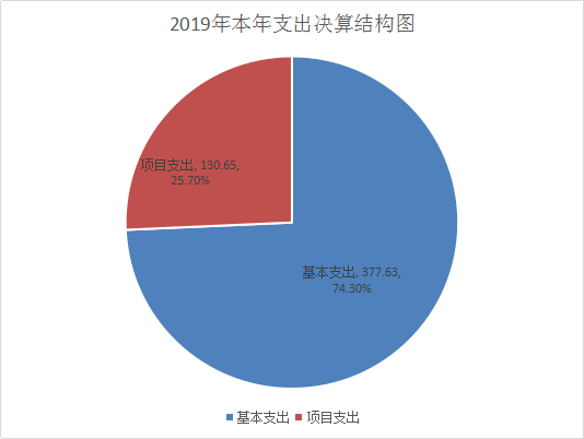 (二)部门财政资金支出情况。2019年本年支出合计508.28万元,其中:基本支出377.63万元,占74.30%;项目支出130.65万元,占25.70%;