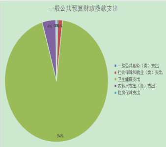 2019年一般公共预算财政拨款支出12867.3万元,主要用于以下方面:一般公共服务(类)支出57.88万元,占0.45%;社会保障和就业(类)支出186.54万元,占1.45%;卫生健康支出12045.82万元,占93.62%;农林水支出(类)546.59万元,占4.25%;住房保障支出30.48万元,占0.24%。